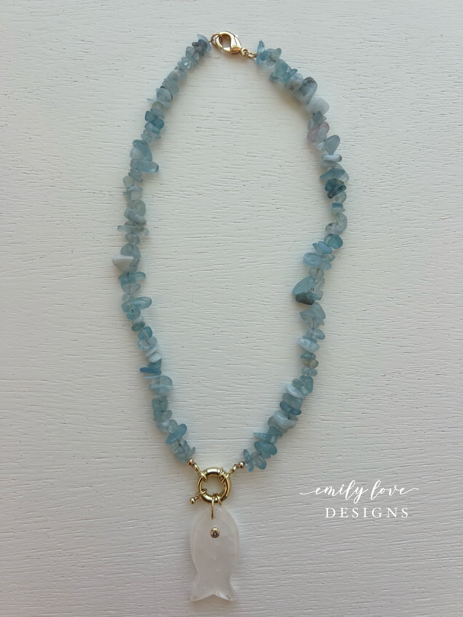 Light blue beaded necklace with sailor clasp and cloudy white fish charm. Approximately 16-17” long.