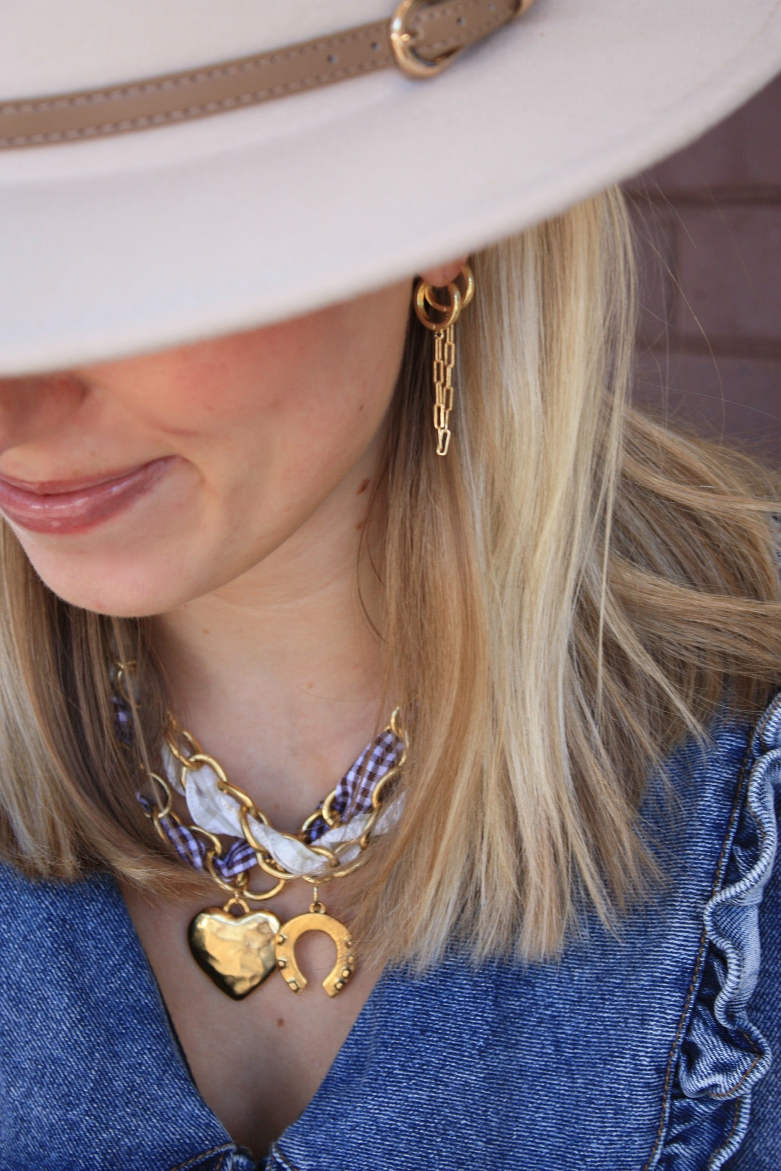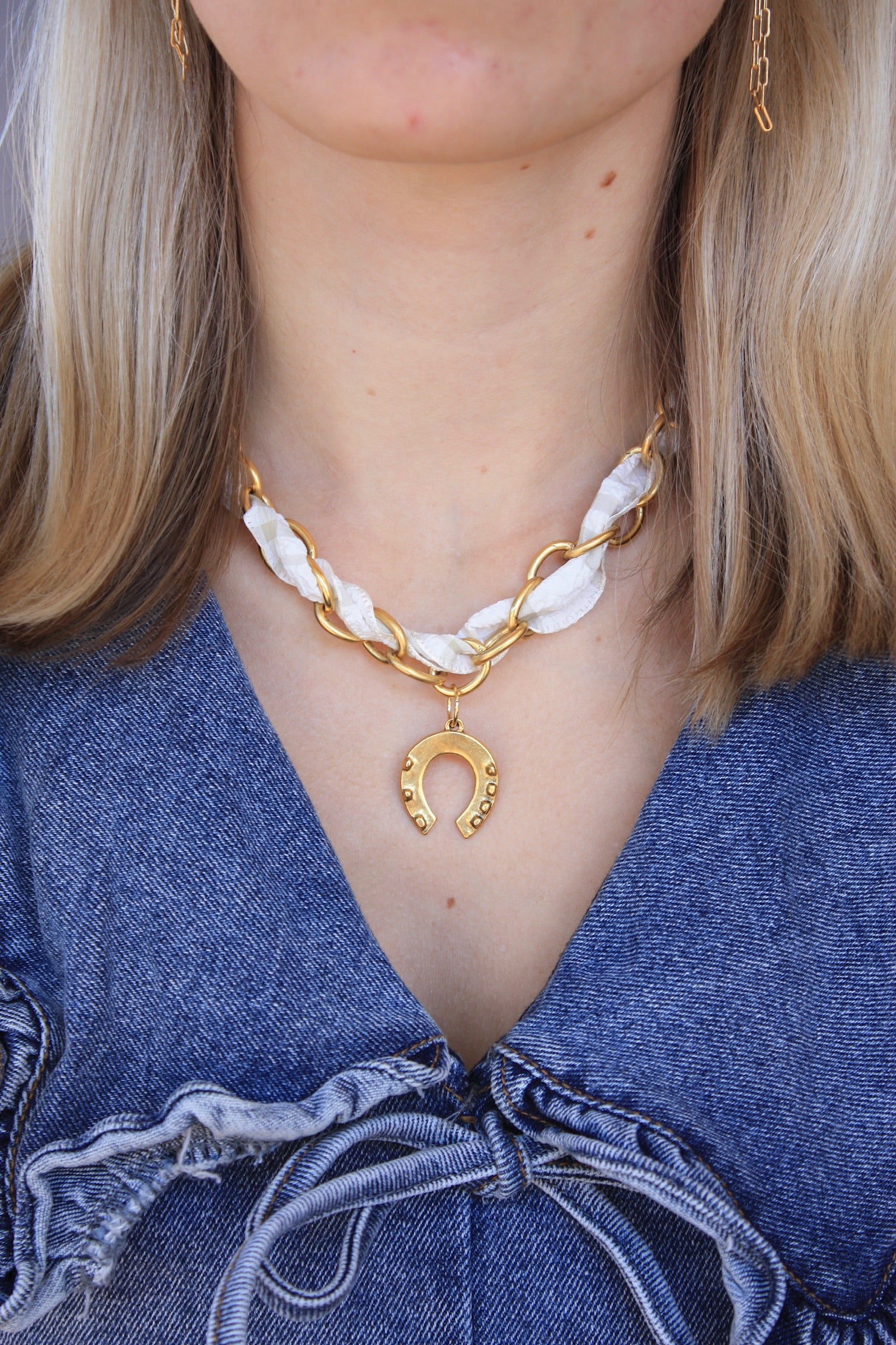 17” antique gold chain with tan and white gingham ruffle ribbon and a horseshoe charm!