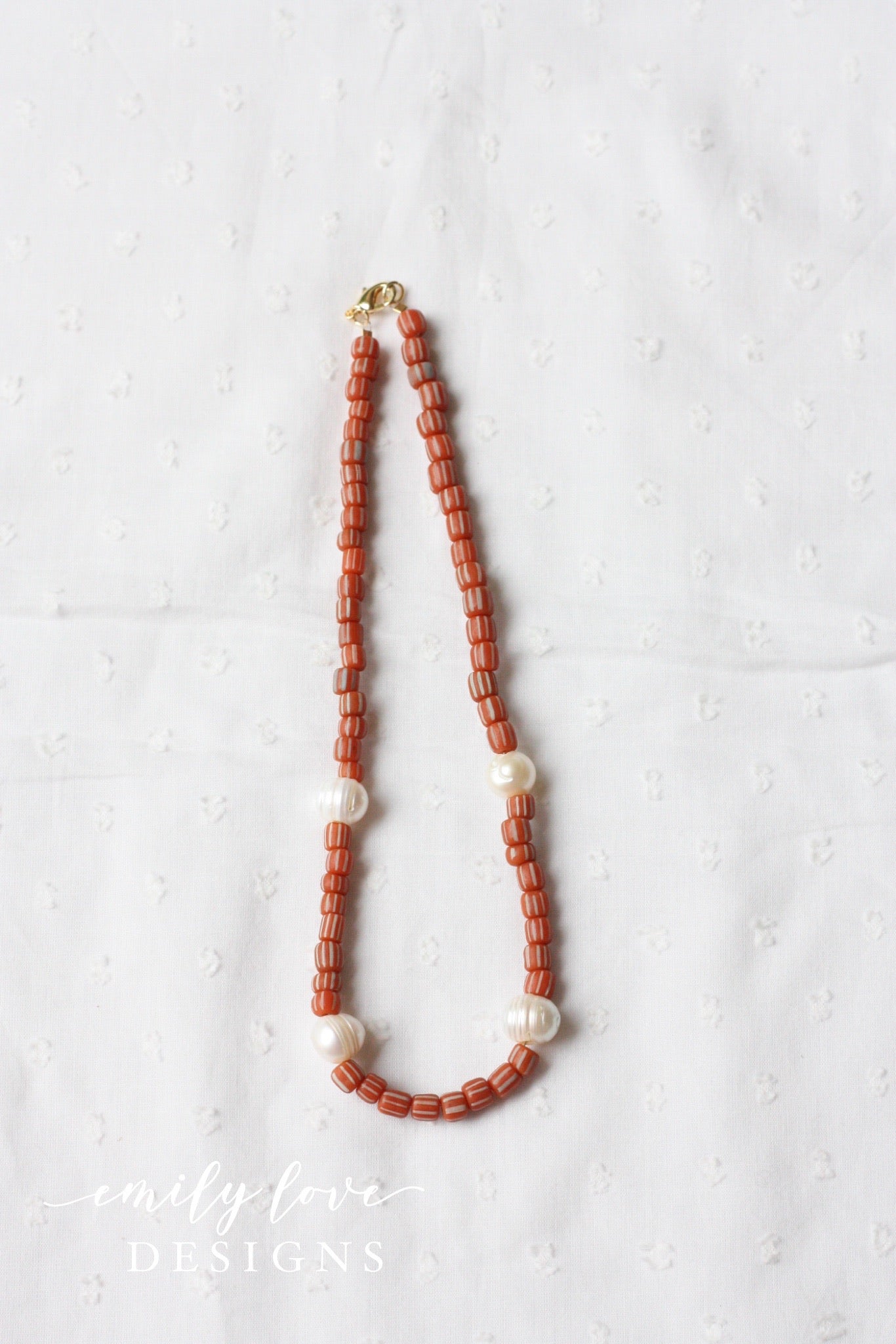 5mm Orange with white striped beaded necklace with 9-10mm pearls. 16”.