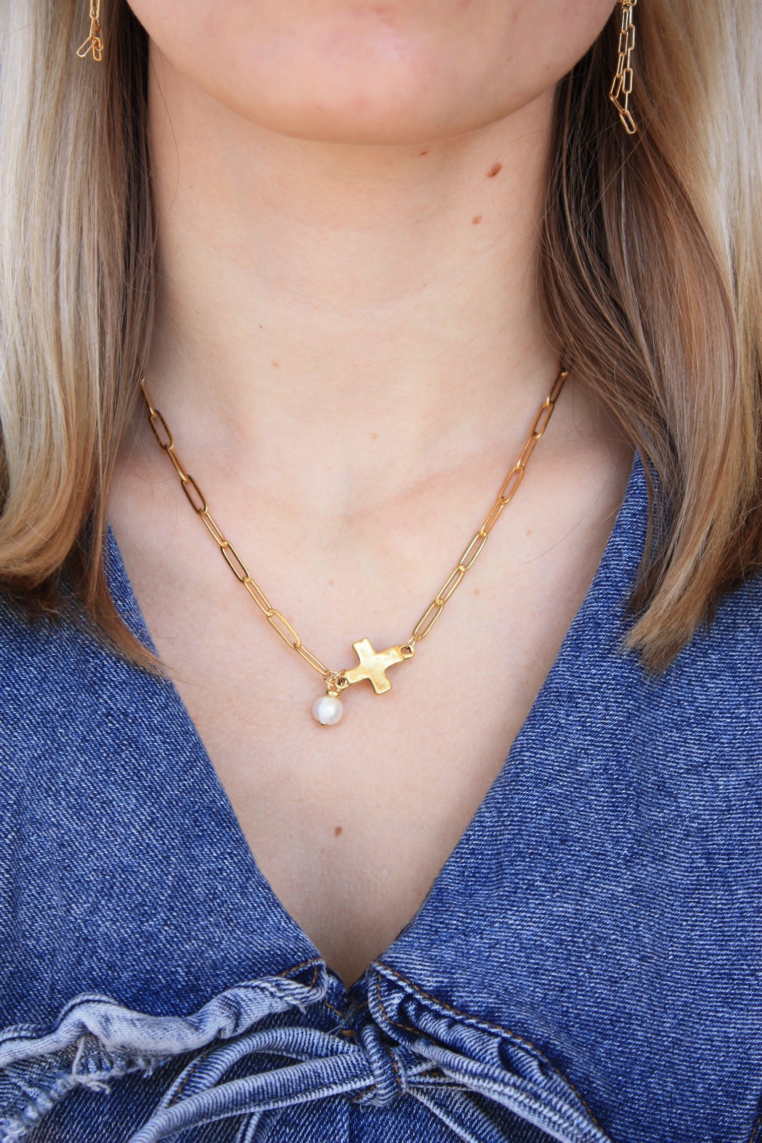 16” gold plated paperclip chain with antique gold cross and pearl charm.