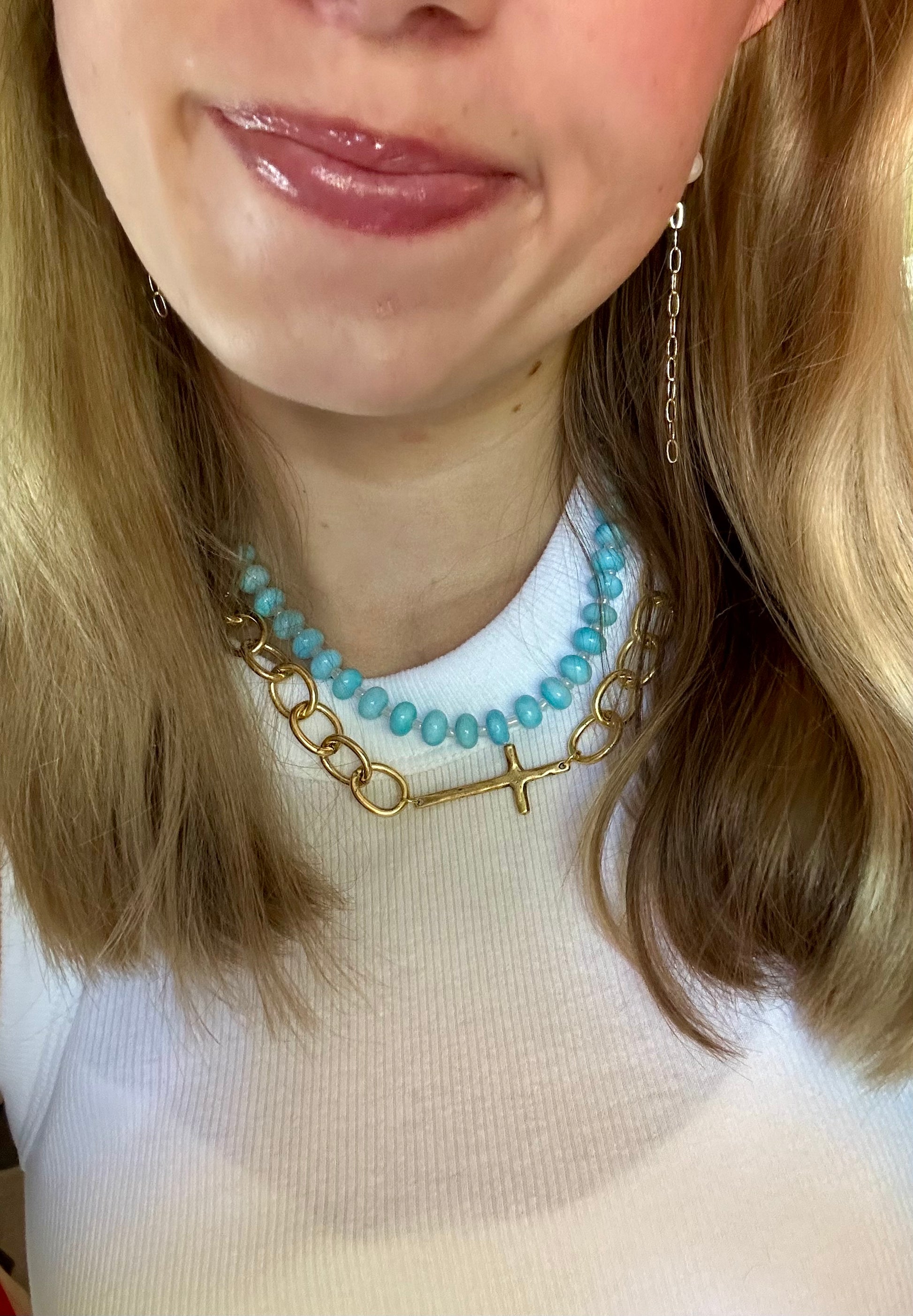 The Breezy! Turquoise rondelle beads separated by iridescent seed beads. 16”